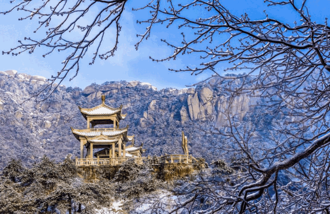 冬季对于天柱山就像是一种馈赠,冰雪是上苍赐予这片土地最神奇的礼物。正值冬季,天柱山大部分日子里,天空就像一面明镜,湛蓝的底板上飘着几朵白色的云朵,淡然,素净,飘逸而轻灵。石径上雪花满地,踩在上面发出脆脆的微响,更增添了几分空旷与幽深。在天柱山,你感觉不出秋冬的界限,因为冬天照样有着秋天般适宜的温湿度。其实我在没去之前就在想,冬天天柱山会是怎样一幅样子啊?会不会是半枝残梗擎剩叶,萧瑟望春早啊?或者是“岁暮风动地,夜寒雪连天”的一番万物凋零,萧索漫天的迹象呢?事实截然相反,冬天的天柱山号称“人间仙境”,白色雪花的点缀,琼枝玉叶,粉妆玉砌,浩然一色,整个世界仿佛都变得更加干净和纯洁。