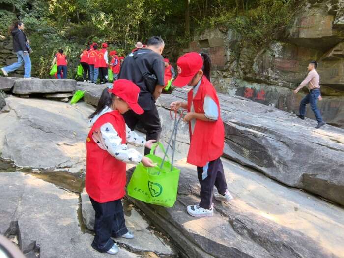山谷流泉景区里,景区志愿者为招募而来的小学生志愿者穿上红色小马甲,戴上小红帽,送上国旗贴纸和小国旗,并带上火钳、方便袋等小工具在景区拾捡垃圾,参与古筝学习、弈棋、朗诵古诗等丰富多彩的互动志愿活动,一抹抹“中国红”流动在景区里,大家都感受到奉献的快乐,一粒粒“爱”的种子悄然播种在小志愿者的心田。与此同时,志愿者们还在山谷流泉文化园、天柱山地质公园博物馆开展免费讲解、宣传天柱山历史文化、天柱山故事等服务。