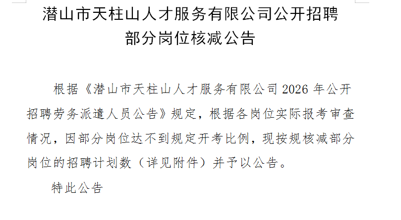 根据《潜山市天柱山人才服务有限公司2026年公开招聘劳务派遣人员公告》规定,根据各岗位实际报考审查情况,因部分岗位达不到规定开考比例,现按规核减部分岗位的招聘计划数(详见附件)并予以公告。 特此公告 潜山市天柱...