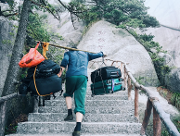 特色: 在天柱山上,经常能碰到挑山工。他们肩上搭一根光溜溜的扁担,两头垂下几根绳子,挂着沉甸甸的物品。登山的时候,他们一只手搭在扁担上,另一只手杵着大杵,保持身体平衡。他们的路线是折尺形的--先从台阶的左侧起步,斜行向上,登上七八级台阶,就到了台的右侧;便转过身子,反方向斜行,到了左侧再转回来,每次转身,扁担换一次肩。他们这样曲折向上登,才能使挂在扁担前头的东西不碰...